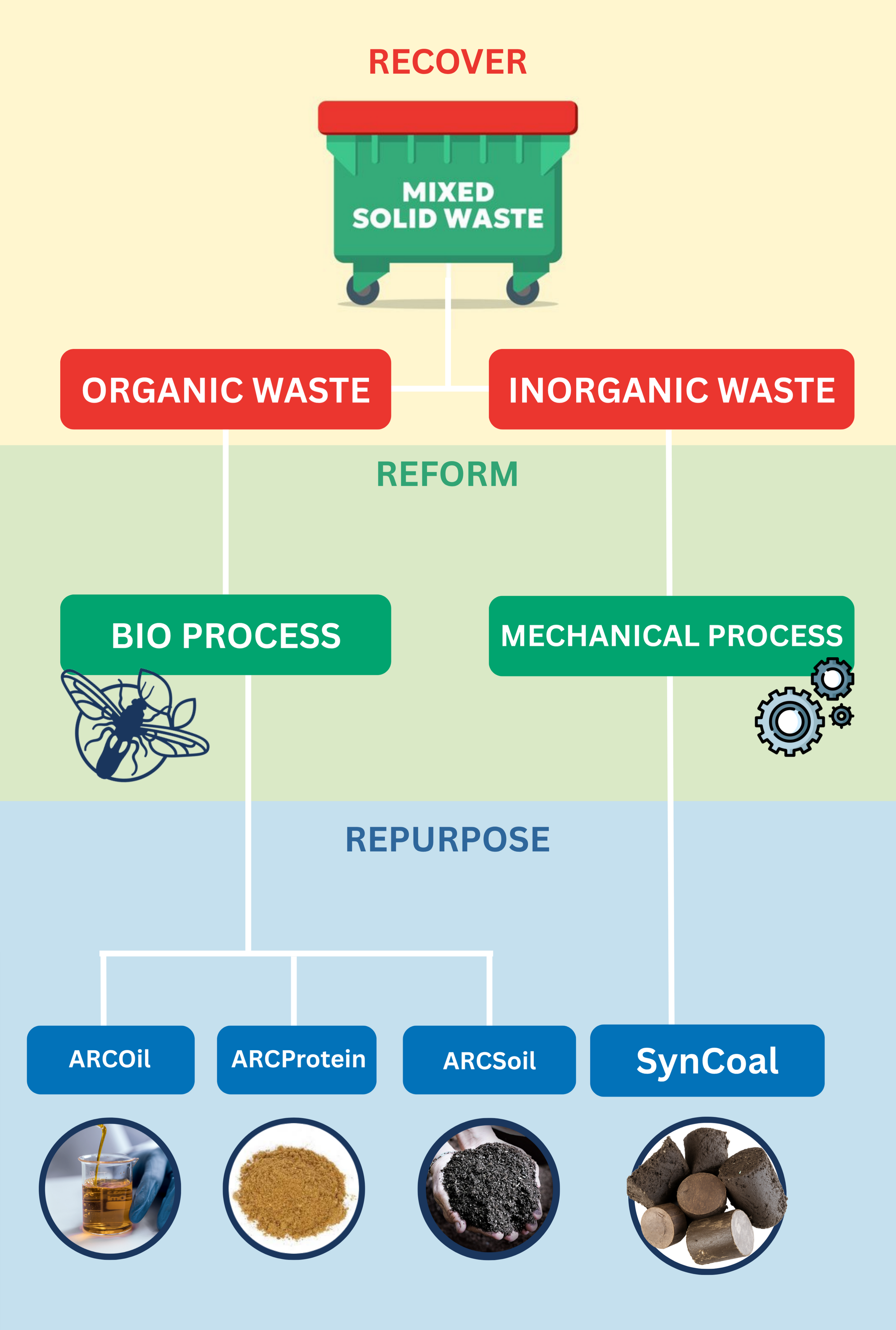 Together, our BSF bioconversion and SynCoal™ platforms demonstrate end-to-end resource recovery: organics back to soils and feeds, residuals into purposeful carbon and hydrogen, closing the loop with practical, scalable infrastructure.